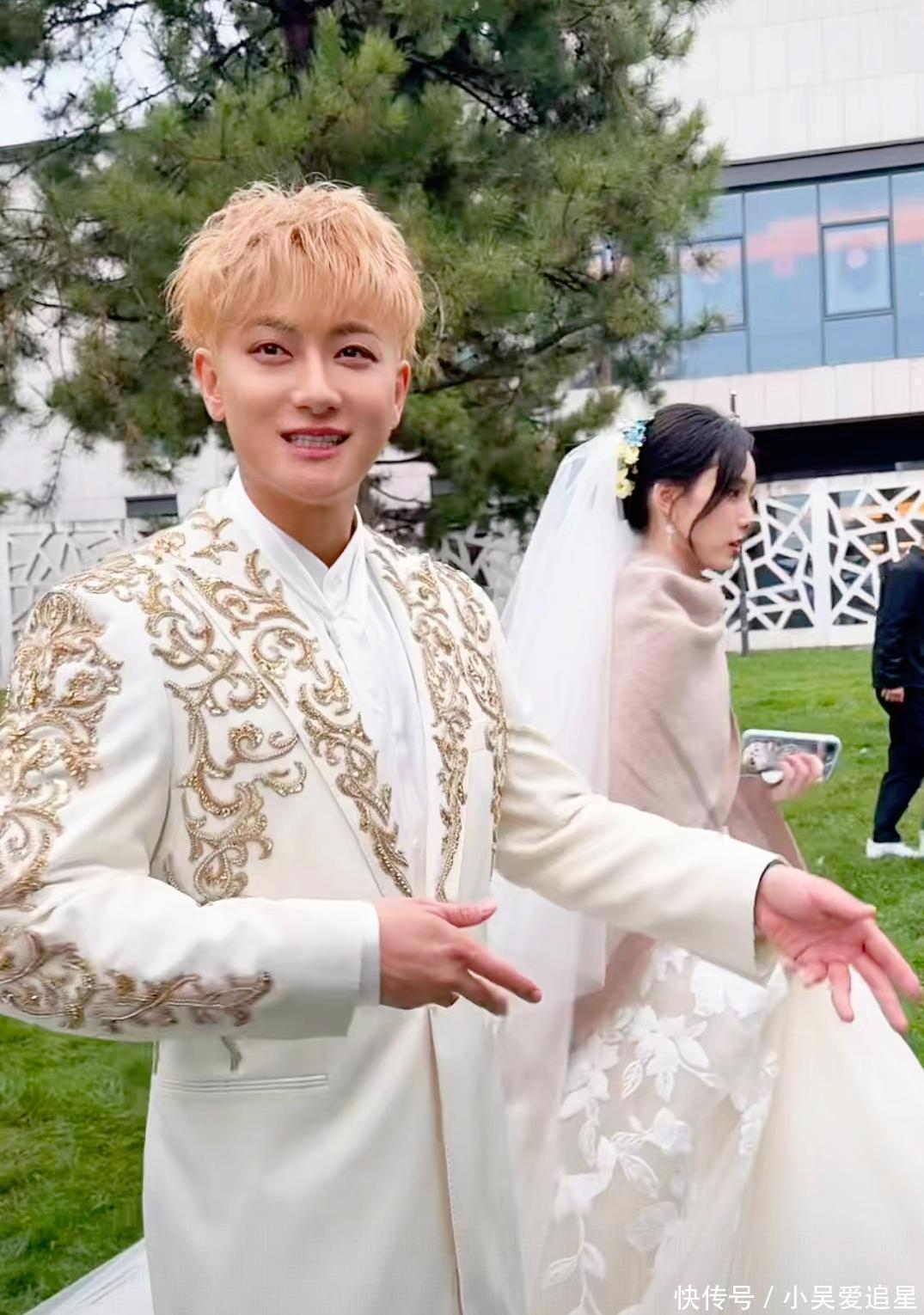 相比之下,黄子韬穿了一套白色刺金的礼服,上身还是长款的设计,搭配一件非常西式的白衬衫,看起来挺像想营造贵族王子的那种感觉。要说的话,还是按规矩来比较合适,那两套黑白色的婚纱照挺不错的。不过,黄毛搭配长款礼服,虽然有点中二少年范,但放在他身上竟然一点不突兀。不少网友纷纷打趣,说是恭喜黄毛终于把公主娶回家啦!