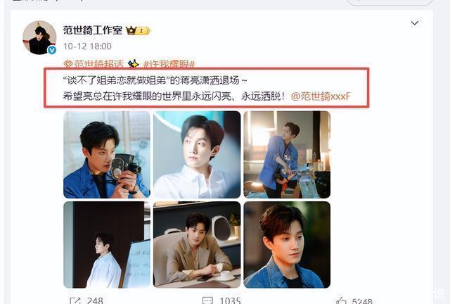 不得不说范先生工作室的这波操作很不错,还为照片配上角色会说的话: “谈不了姐弟恋就做姐弟的蒋亮潇洒退场,希望亮总在许我耀眼的世界里永远闪亮、永远洒脱!