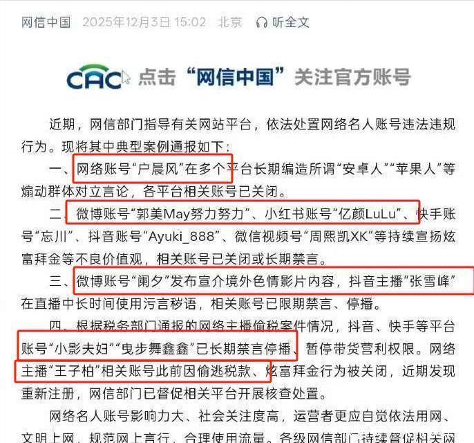 户晨风,长期在网上以“苹果人”、“安卓人”这种标签来划分群体搞对立,这种人被封了那是活该,但张雪峰被封网友们就有点同情他了。